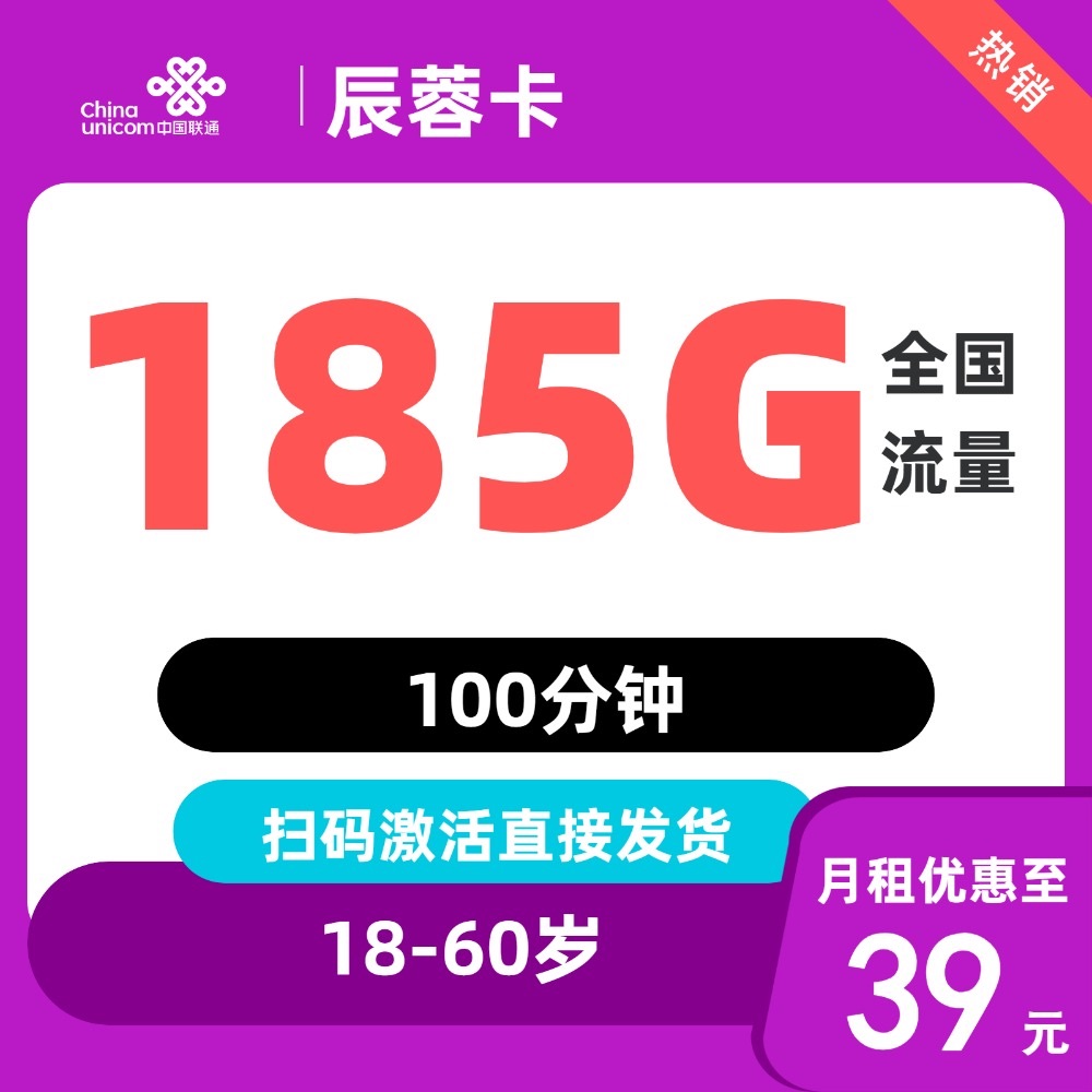 套餐2:(18-60岁)全国发无禁区长期联通辰蓉卡39元155G通用➕30G定向➕100分钟